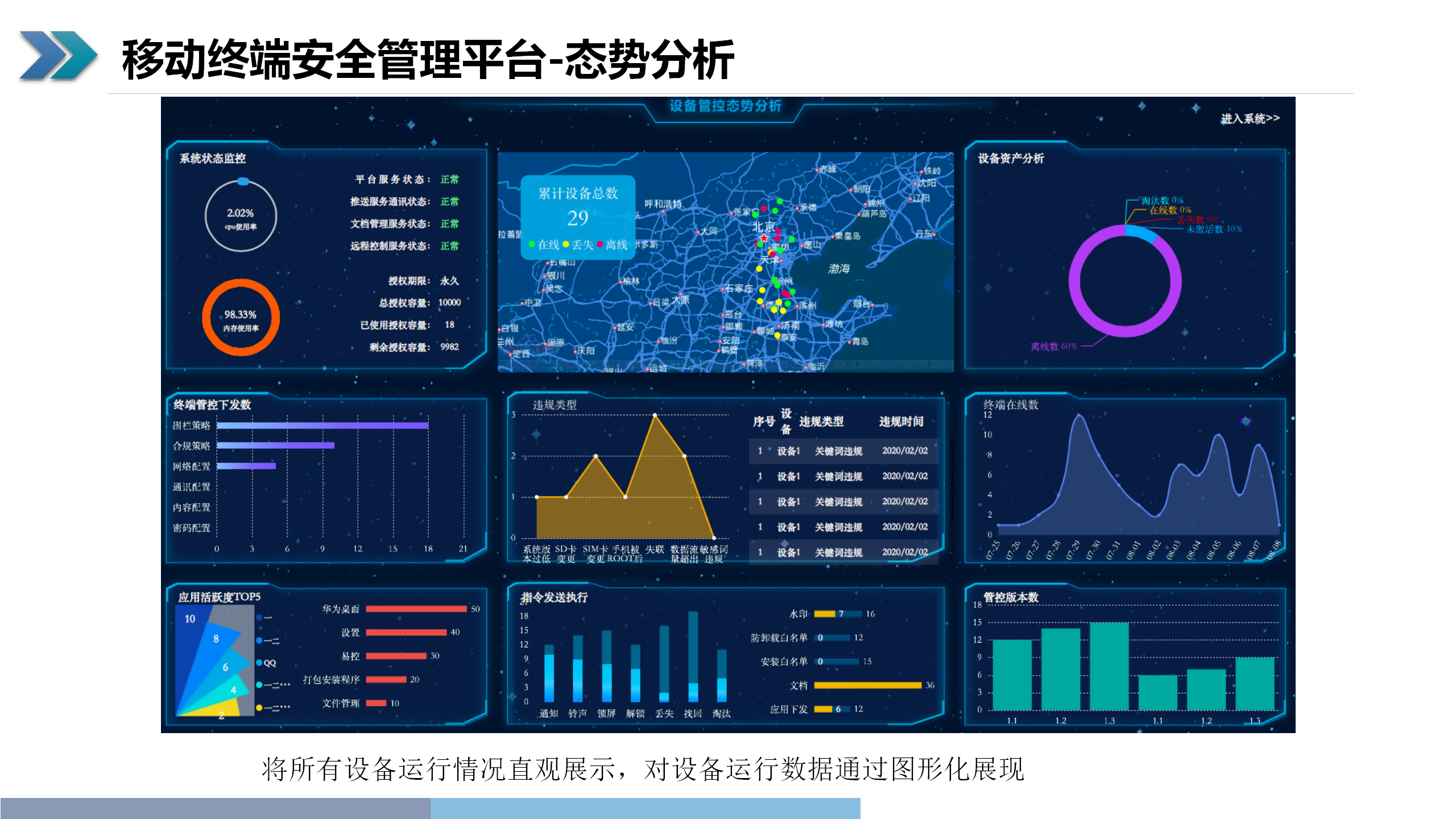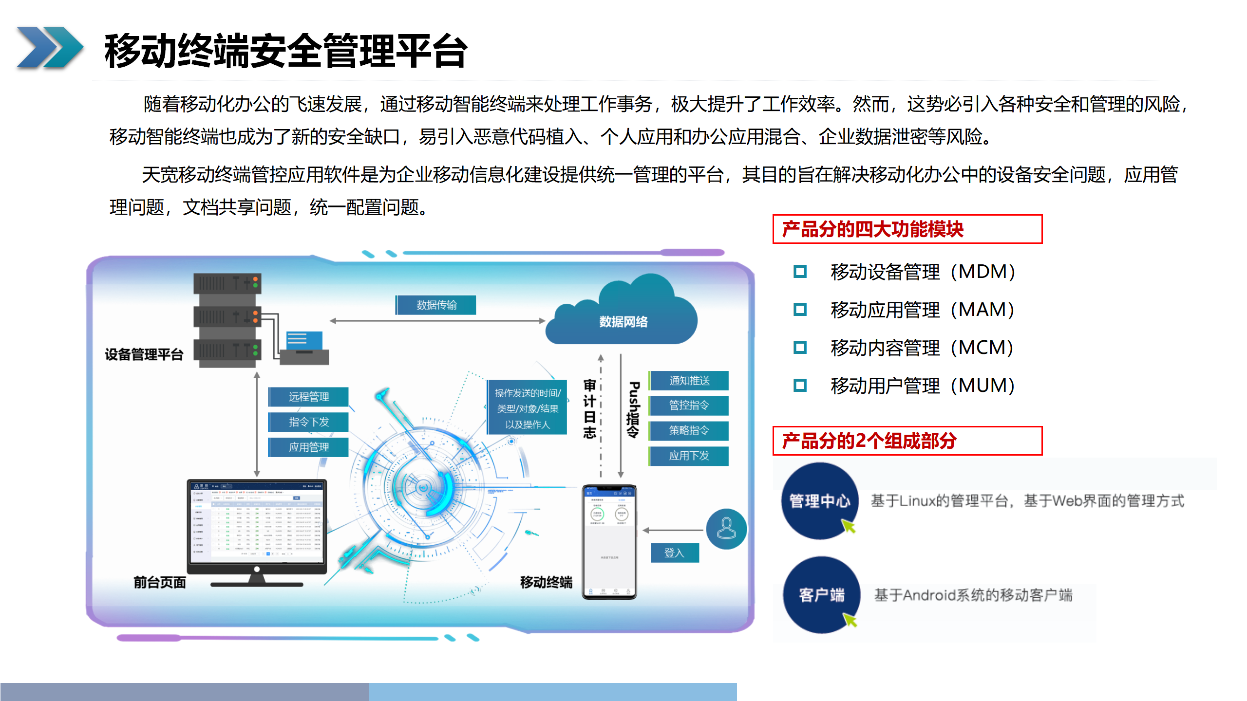 天寬移動(dòng)終端安全管理平臺(tái)是為企業(yè)移動(dòng)信息化建設(shè)提供的統(tǒng)一管理平臺(tái),旨在解決移動(dòng)化辦公中的設(shè)備安全問題、應(yīng)用管理問題、文檔共享問題、統(tǒng)一配置問題等,保證移動(dòng)設(shè)備使用的安全合規(guī)性,依托后臺(tái)服務(wù)器對相關(guān)賬號的注冊、激活進(jìn)行管理,通過終端環(huán)境等多方協(xié)同的安全管理技術(shù)、防護(hù)機(jī)制等手段,加強(qiáng)對移動(dòng)智能終端應(yīng)用程序的掌控和對惡意應(yīng)用及行為的責(zé)任追究能力,建立更加安全可控的移動(dòng)終端應(yīng)用環(huán)境。
