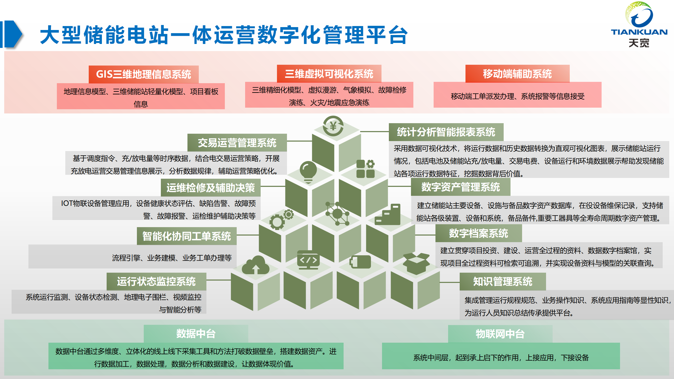 新能源統(tǒng)一運(yùn)營(yíng)平臺(tái)可匹配光伏、風(fēng)電等新能源系統(tǒng),包含集成監(jiān)控系統(tǒng)、能量管理系統(tǒng)、電池管理系統(tǒng)、火災(zāi)報(bào)警系統(tǒng)、視頻安防監(jiān)控系統(tǒng)、電子圍欄等系統(tǒng)數(shù)據(jù)與視頻等智能IOT 設(shè)備,可對(duì)環(huán)境數(shù)據(jù)采集、監(jiān)測(cè)電纜運(yùn)行、設(shè)備外部溫度等狀態(tài),實(shí)現(xiàn)對(duì)新能源設(shè)備運(yùn)行數(shù)據(jù)的采集,并對(duì)新能源系統(tǒng)進(jìn)行能量轉(zhuǎn)移、調(diào)頻服務(wù)、削峰填谷、調(diào)峰應(yīng)用等。在電力調(diào)度部門的監(jiān)控和指揮下,通過儲(chǔ)能站能量管理系統(tǒng) EMS進(jìn)行集中控制。