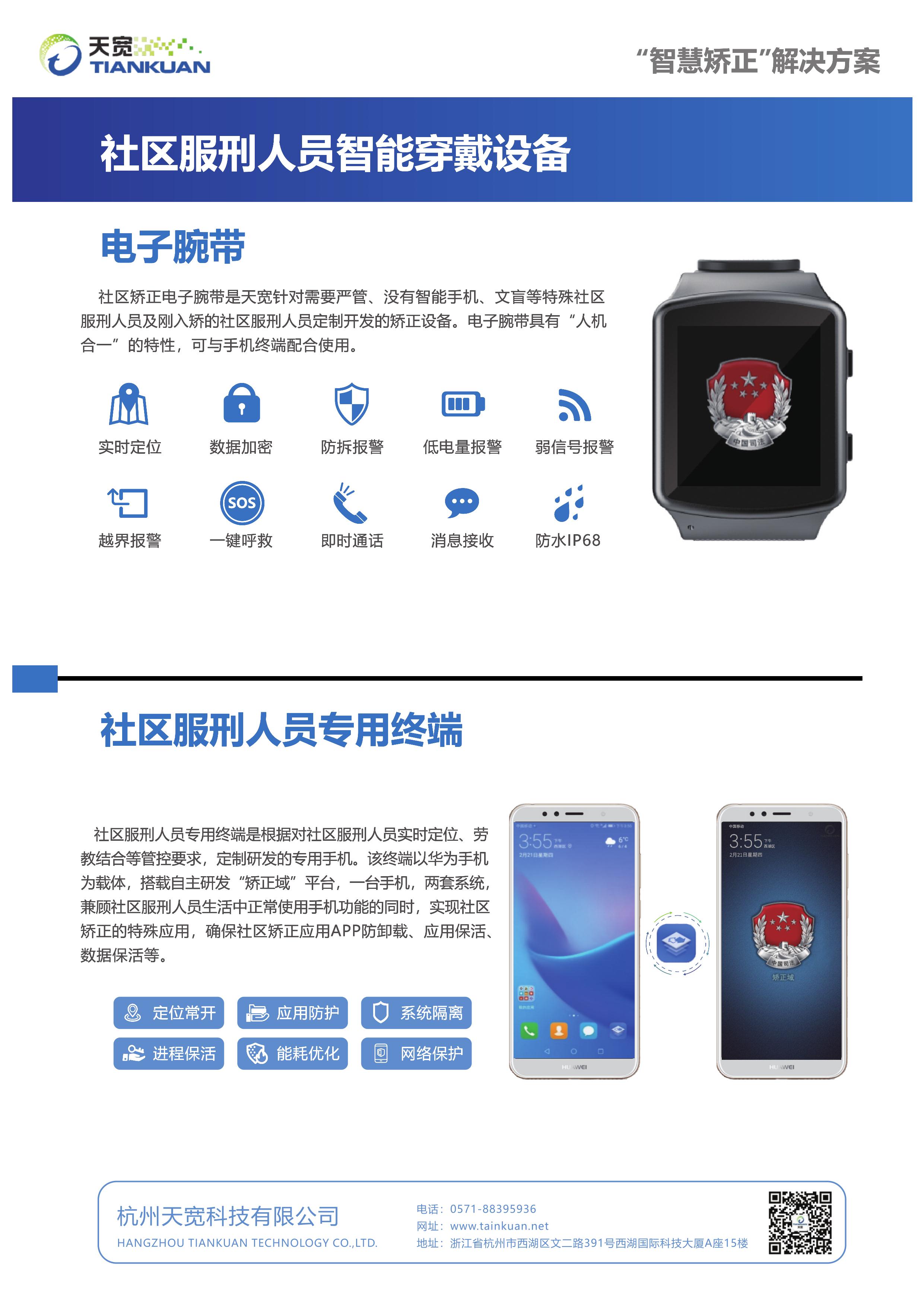 天寬“智慧矯正”移動(dòng)終端解決方案以華為智能手機(jī)為載體,搭載自主研發(fā)的“安全域” 平臺(tái),為社區(qū)服刑人員、執(zhí)法人員提供軟件應(yīng)用的安全環(huán)境、一機(jī)兩用、保證矯正效果的同時(shí)不影響生活中正常使用手機(jī)功能。個(gè)人裝備類整體解決方案包括內(nèi)容有電子腕帶、社區(qū)服刑人員專用終端、以及執(zhí)法人員使用的執(zhí)法終端。