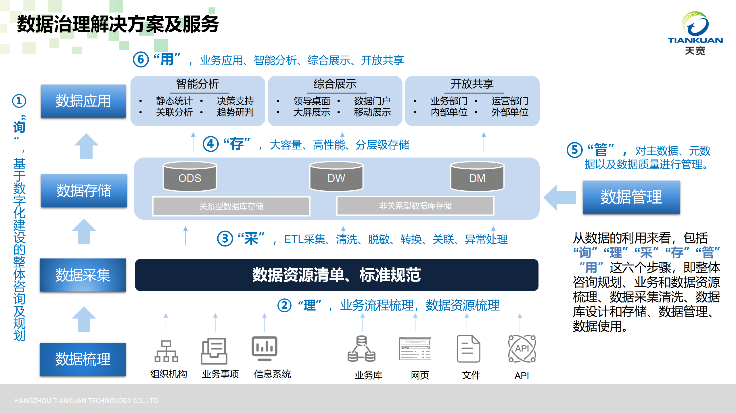 從數(shù)據(jù)“詢”、“理”、“采”、“存”、“管”、“用”六個步驟出發(fā),提供整體咨詢規(guī)劃、業(yè)務和數(shù)據(jù)資源梳理、數(shù)據(jù)采集清洗、數(shù)據(jù)庫設計和存儲、數(shù)據(jù)管理、數(shù)據(jù)使用等數(shù)據(jù)治理解決方案及服務,幫助客戶更有效地管理其數(shù)據(jù)資產,確保數(shù)據(jù)的質量和安全,并支持數(shù)據(jù)驅動的決策和創(chuàng)新。